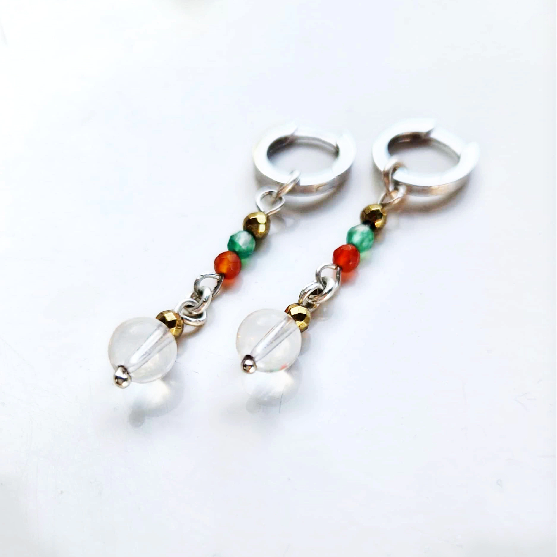 Composées d’argent 925, elles associent la chaleur dorée de l’hématite à la fraîcheur de l’agate verte et à l’éclat orangé de l’agate de feu.