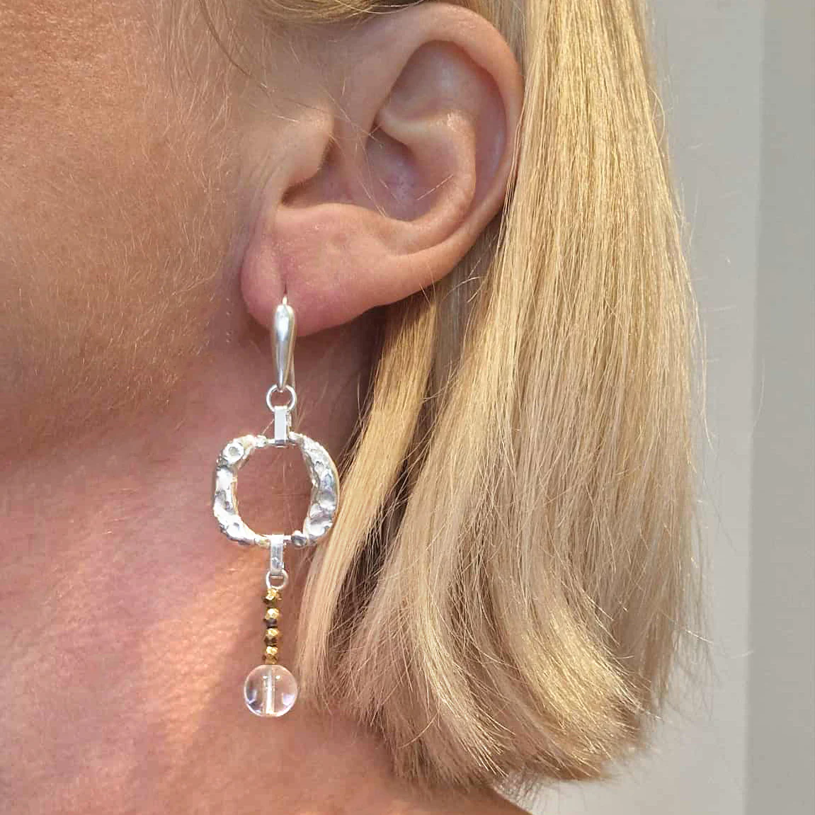 Les boucles d’oreilles Solstice marient la texture organique de l’argent 925 à la transparence du cristal de roche.