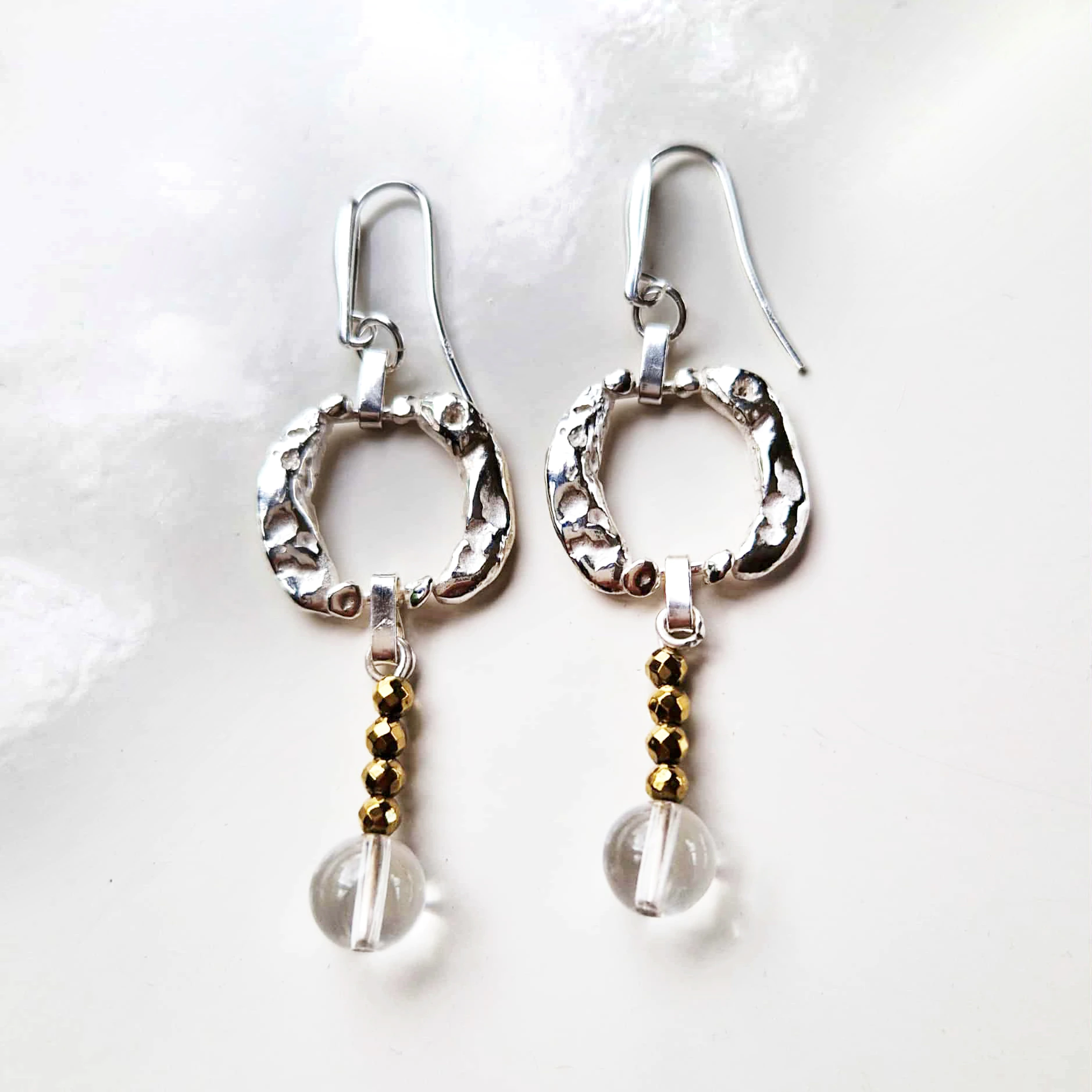 Leur anneau martelé évoque la matière brute, tandis qu’une cascade de perles d’hématite dorée conduit le regard vers la sphère pure et limpide du cristal.